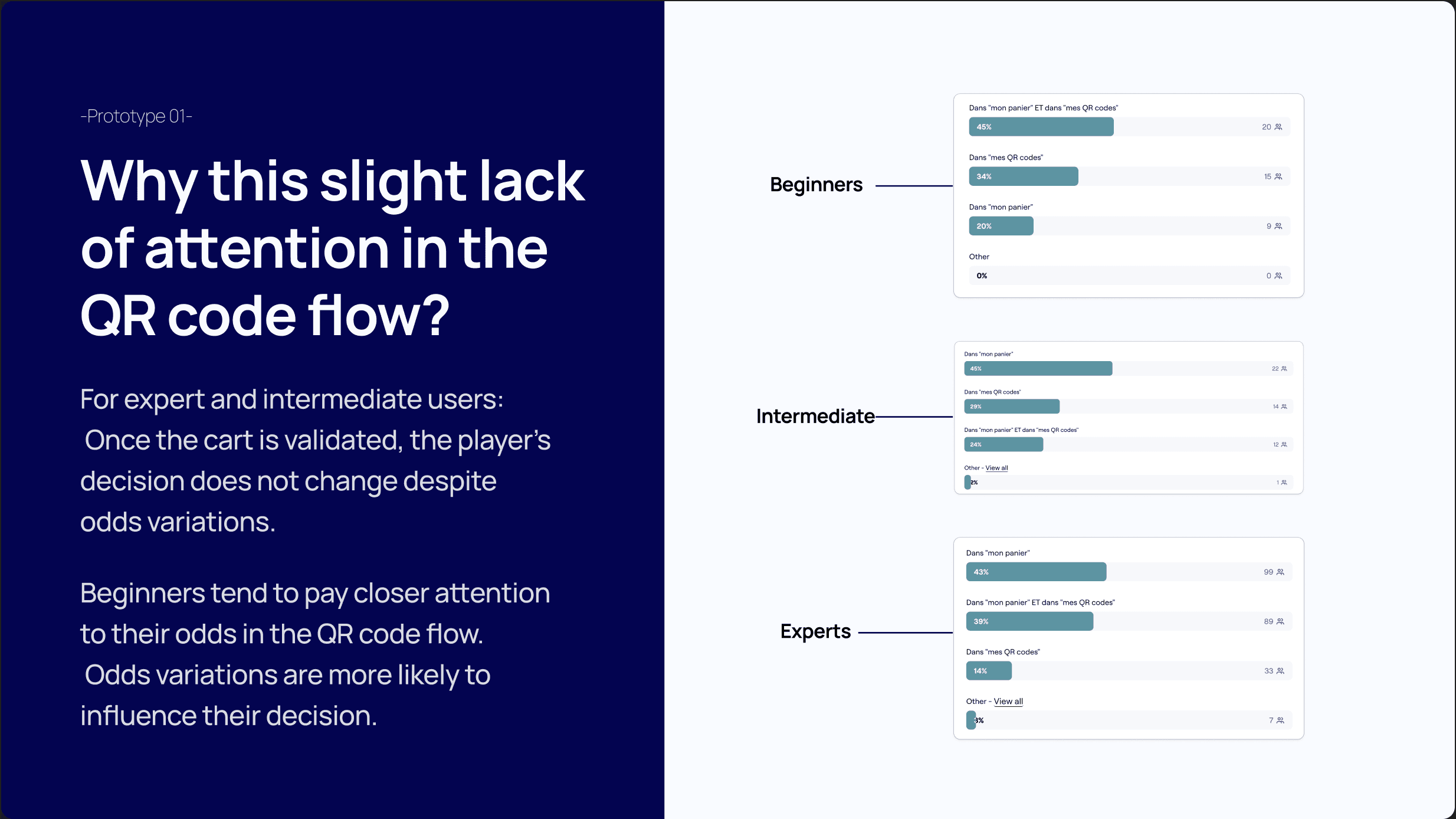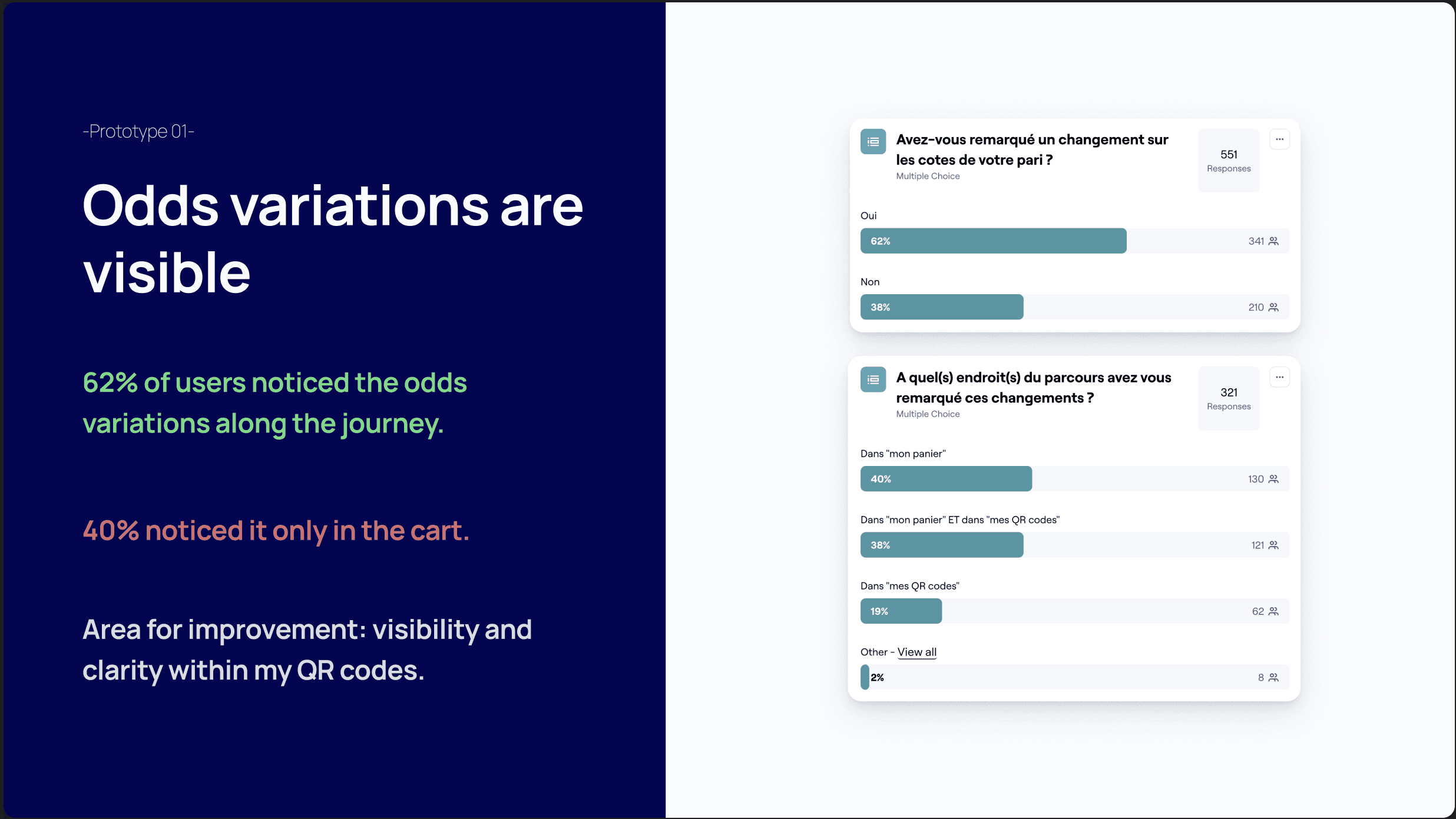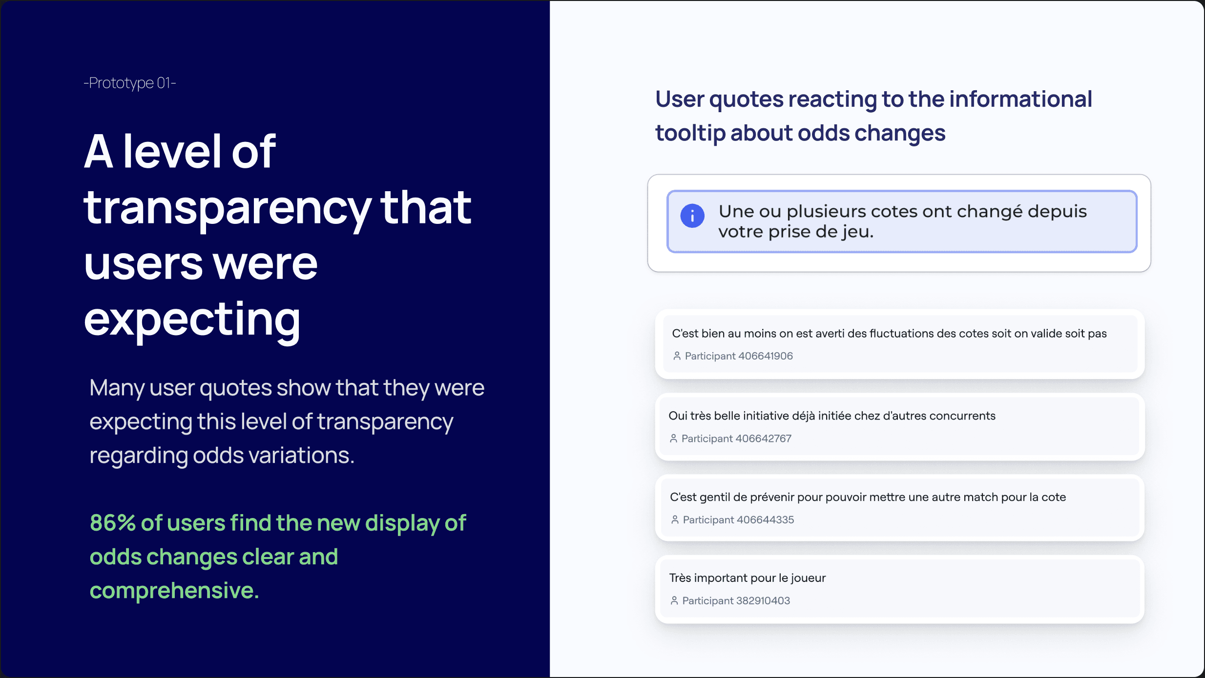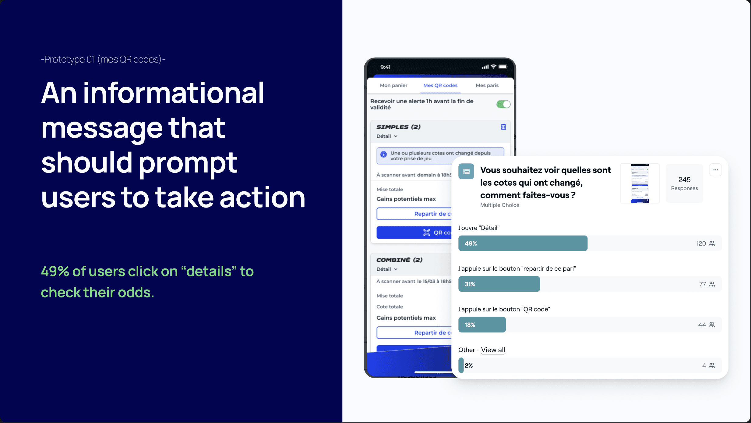 After identifying the critical screens, we sketched several solution hypotheses and turned them into interactive prototypes to run a user test in Maze. The goal was to validate how well users understood the solution and how attractive it was. We also used this Maze study to ask questions about how users react to odds changes, to confirm that this was a problem worth solving.