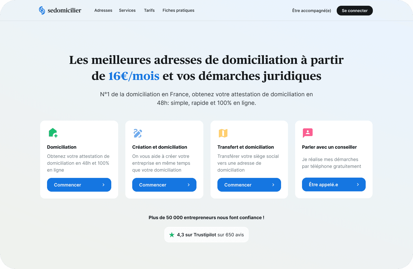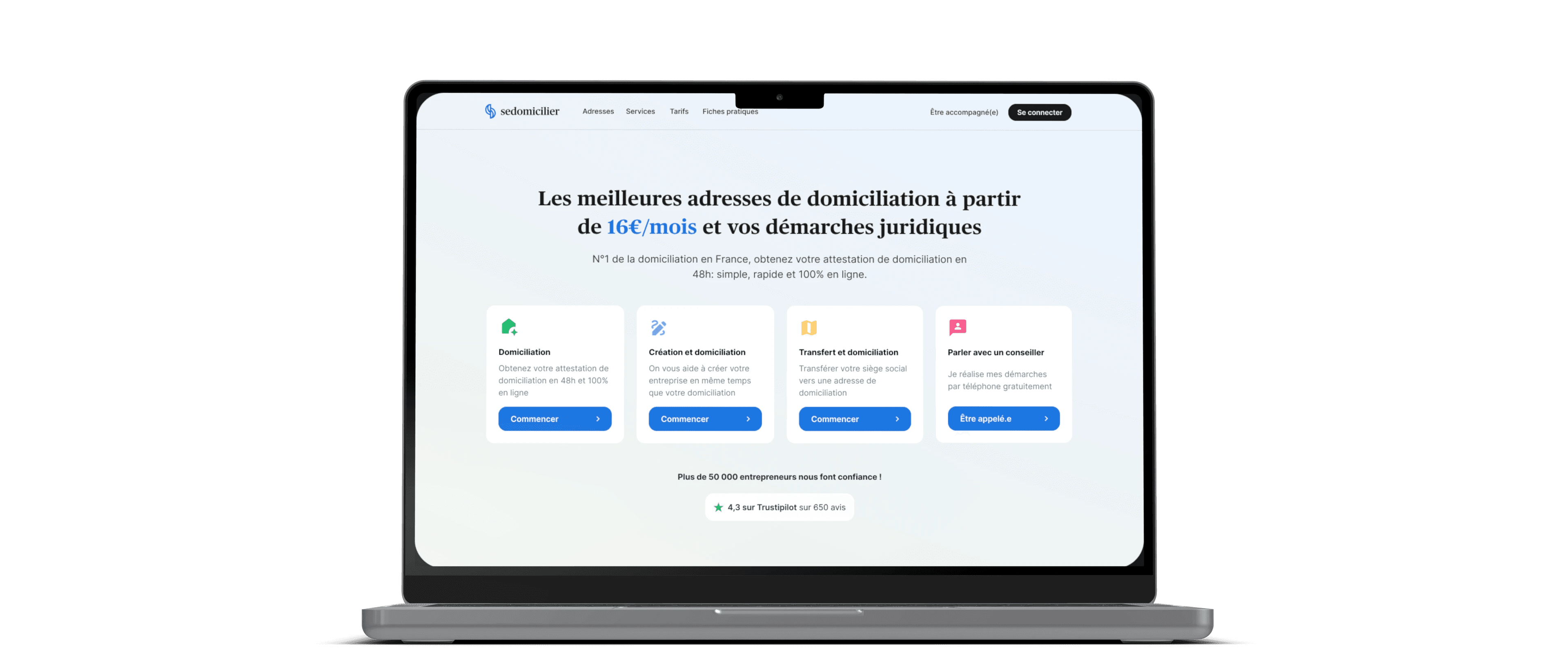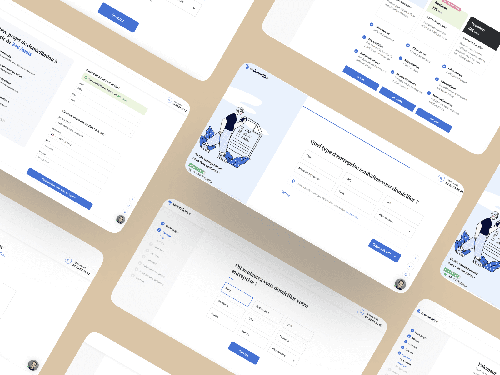 For SeDomicilier (Tech), I redesigned a B2B domiciliation flow to be clearer and shorter. Goal: cut abandonment, explain the mail offer, and keep pricing 100% consistent through to payment.